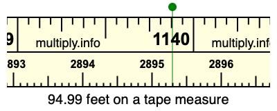 94.99 feet times 30.48 equals 2895.2952 centimeters. Therefore, 94.99 feet is also at the 2895.2952 centimeters place on the tape measure, as displayed above.