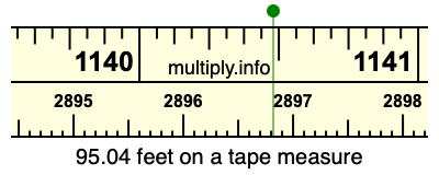 95.04 feet times 30.48 equals 2896.8192 centimeters. Therefore, 95.04 feet is also at the 2896.8192 centimeters place on the tape measure, as displayed above.