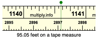 95.05 feet times 30.48 equals 2897.124 centimeters. Therefore, 95.05 feet is also at the 2897.124 centimeters place on the tape measure, as displayed above.