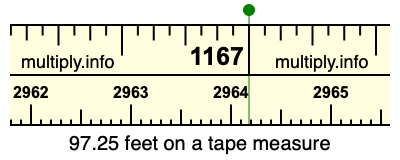 97.25 feet times 12 equals 1167 inches. Therefore, 97.25 feet is at the 1167 inches place on the tape measure, as displayed below.