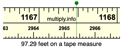 97.29 feet times 12 equals 1167.48 inches. Therefore, 97.29 feet is at the 1167.48 inches place on the tape measure, as displayed below.