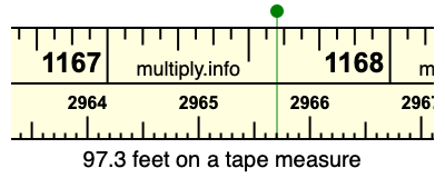 97.3 feet times 12 equals 1167.6 inches. Therefore, 97.3 feet is at the 1167.6 inches place on the tape measure, as displayed below.