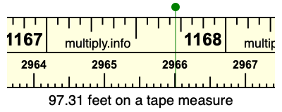 97.31 feet times 30.48 equals 2966.0088 centimeters. Therefore, 97.31 feet is also at the 2966.0088 centimeters place on the tape measure, as displayed above.