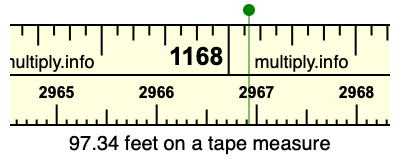 97.34 feet times 30.48 equals 2966.9232 centimeters. Therefore, 97.34 feet is also at the 2966.9232 centimeters place on the tape measure, as displayed above.
