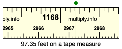 97.35 feet times 12 equals 1168.2 inches. Therefore, 97.35 feet is at the 1168.2 inches place on the tape measure, as displayed below.