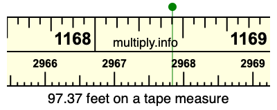 97.37 feet times 30.48 equals 2967.8376 centimeters. Therefore, 97.37 feet is also at the 2967.8376 centimeters place on the tape measure, as displayed above.