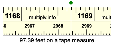 97.39 feet times 12 equals 1168.68 inches. Therefore, 97.39 feet is at the 1168.68 inches place on the tape measure, as displayed below.