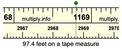 97.4 feet times 12 equals 1168.8 inches. Therefore, 97.4 feet is at the 1168.8 inches place on the tape measure, as displayed below.