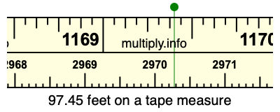 97.45 feet times 30.48 equals 2970.276 centimeters. Therefore, 97.45 feet is also at the 2970.276 centimeters place on the tape measure, as displayed above.