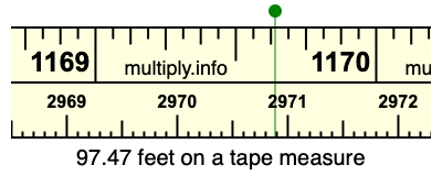 97.47 feet times 30.48 equals 2970.8856 centimeters. Therefore, 97.47 feet is also at the 2970.8856 centimeters place on the tape measure, as displayed above.