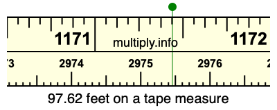 97.62 feet times 30.48 equals 2975.4576 centimeters. Therefore, 97.62 feet is also at the 2975.4576 centimeters place on the tape measure, as displayed above.