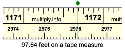 97.64 feet times 30.48 equals 2976.0672 centimeters. Therefore, 97.64 feet is also at the 2976.0672 centimeters place on the tape measure, as displayed above.