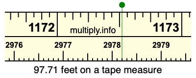 97.71 feet times 30.48 equals 2978.2008 centimeters. Therefore, 97.71 feet is also at the 2978.2008 centimeters place on the tape measure, as displayed above.
