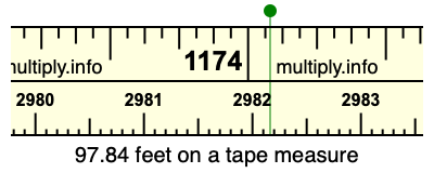 97.84 feet times 30.48 equals 2982.1632 centimeters. Therefore, 97.84 feet is also at the 2982.1632 centimeters place on the tape measure, as displayed above.