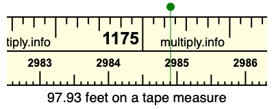 97.93 feet times 30.48 equals 2984.9064 centimeters. Therefore, 97.93 feet is also at the 2984.9064 centimeters place on the tape measure, as displayed above.