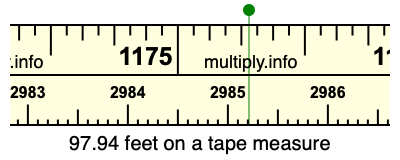97.94 feet times 30.48 equals 2985.2112 centimeters. Therefore, 97.94 feet is also at the 2985.2112 centimeters place on the tape measure, as displayed above.