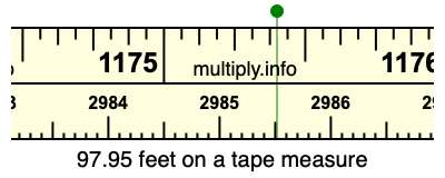 97.95 feet times 30.48 equals 2985.516 centimeters. Therefore, 97.95 feet is also at the 2985.516 centimeters place on the tape measure, as displayed above.