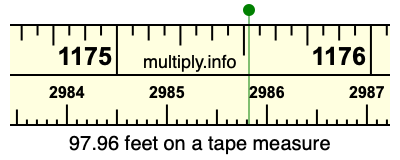 97.96 feet times 30.48 equals 2985.8208 centimeters. Therefore, 97.96 feet is also at the 2985.8208 centimeters place on the tape measure, as displayed above.