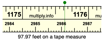 97.97 feet times 30.48 equals 2986.1256 centimeters. Therefore, 97.97 feet is also at the 2986.1256 centimeters place on the tape measure, as displayed above.