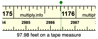 97.98 feet times 30.48 equals 2986.4304 centimeters. Therefore, 97.98 feet is also at the 2986.4304 centimeters place on the tape measure, as displayed above.