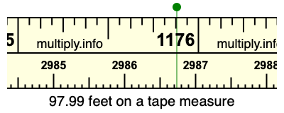 97.99 feet times 12 equals 1175.88 inches. Therefore, 97.99 feet is at the 1175.88 inches place on the tape measure, as displayed below.