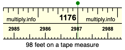 98 feet times 12 equals 1176 inches. Therefore, 98 feet is at the 1176 inches place on the tape measure, as displayed below.