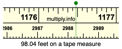 98.04 feet times 30.48 equals 2988.2592 centimeters. Therefore, 98.04 feet is also at the 2988.2592 centimeters place on the tape measure, as displayed above.