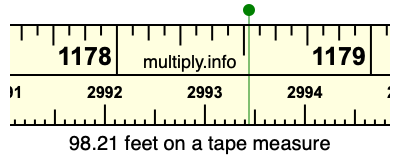 98.21 feet times 30.48 equals 2993.4408 centimeters. Therefore, 98.21 feet is also at the 2993.4408 centimeters place on the tape measure, as displayed above.