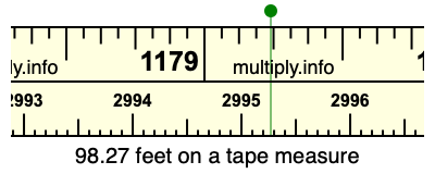 98.27 feet times 30.48 equals 2995.2696 centimeters. Therefore, 98.27 feet is also at the 2995.2696 centimeters place on the tape measure, as displayed above.