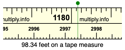 98.34 feet times 12 equals 1180.08 inches. Therefore, 98.34 feet is at the 1180.08 inches place on the tape measure, as displayed below.