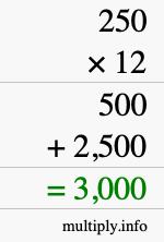 As you can see from the illustration above, the answer to 250 times 12 is the green number in the bottom row. The answer is 3,000.