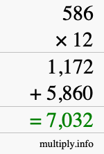 As you can see from the illustration above, the answer to 586 times 12 is the green number in the bottom row. The answer is 7,032.