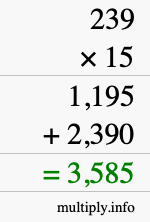 As you can see from the illustration above, the answer to 239 times 15 is the green number in the bottom row. The answer is 3,585.
