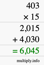 As you can see from the illustration above, the answer to 403 times 15 is the green number in the bottom row. The answer is 6,045.