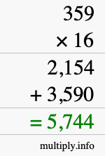 As you can see from the illustration above, the answer to 359 times 16 is the green number in the bottom row. The answer is 5,744.