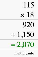 Then we multiply the ones digit of 18 with each digit of 115, and write the products in the next row, from right to left. (If the product is greater than 9, carry the tens digit to the next column.)
