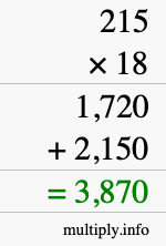 Then we multiply the ones digit of 18 with each digit of 215, and write the products in the next row, from right to left. (If the product is greater than 9, carry the tens digit to the next column.)
