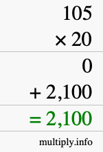 Now we write a 0 in the next row, then multiply the tens digit of 20 with each digit of 105, and write down the products. (Again, if the product is greater than 9, carry the tens digit to the next column.)