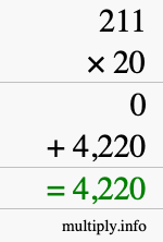 Now we write a 0 in the next row, then multiply the tens digit of 20 with each digit of 211, and write down the products. (Again, if the product is greater than 9, carry the tens digit to the next column.)