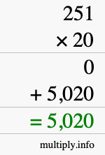 As you can see from the illustration above, the answer to 251 times 20 is the green number in the bottom row. The answer is 5,020.