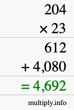 As you can see from the illustration above, the answer to 204 times 23 is the green number in the bottom row. The answer is 4,692.