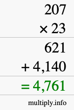 As you can see from the illustration above, the answer to 207 times 23 is the green number in the bottom row. The answer is 4,761.
