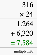 Here you will learn how to calculate 316 multiplied by 24 using long multiplication. In other words, learn how to use long multiplication to find the answer to 316 times 24. We will first give you step-by-step instructions, and then we will illustrate with an image what we did.