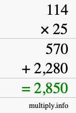 Here you will learn how to calculate 114 multiplied by 25 using long multiplication. In other words, learn how to use long multiplication to find the answer to 114 times 25. We will first give you step-by-step instructions, and then we will illustrate with an image what we did.