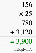 Here you will learn how to calculate 156 multiplied by 25 using long multiplication. In other words, learn how to use long multiplication to find the answer to 156 times 25. We will first give you step-by-step instructions, and then we will illustrate with an image what we did.