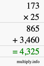 As you can see from the illustration above, the answer to 173 times 25 is the green number in the bottom row. The answer is 4,325.