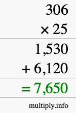 As you can see from the illustration above, the answer to 306 times 25 is the green number in the bottom row. The answer is 7,650.