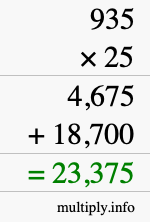 As you can see from the illustration above, the answer to 935 times 25 is the green number in the bottom row. The answer is 23,375.