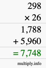 As you can see from the illustration above, the answer to 298 times 26 is the green number in the bottom row. The answer is 7,748.