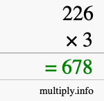 As you can see from the illustration above, the answer to 226 times 3 is the green number in the bottom row. The answer is 678.